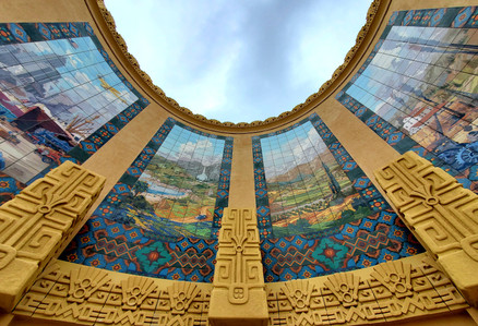 The four murals -- depicting commerce, scenic beauty, agriculture and industry -- were originally painted on fiberboard by Hollywood artist Juan Larrinaga. They were installed above the entrance to what was originally the California State Building at the California Pacific International Exposition in 1935-36. The 18-foot-high murals were discarded soon after the fair and have been recreated in permanent ceramic tiles after six years of investigation, design and fabrication by RTK Studios in Ojai, Calif. Lost ornamentation also was recreated. The $715,000 effort was funded by donations to C100 from members, supporters and local agencies and institutions.